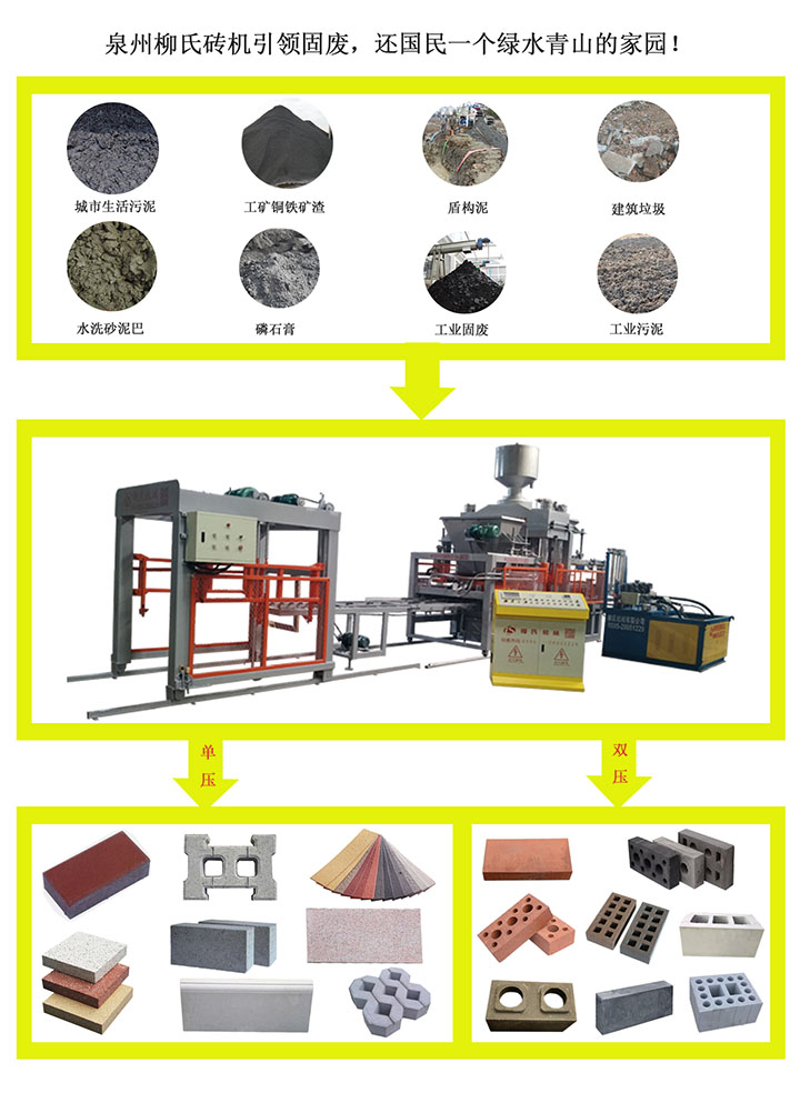 (3)固廢制磚,可以按材料性質(zhì)及配比來選擇不同的機(jī)型。一般含泥量比較高的就采用液壓磚機(jī)來生產(chǎn),含泥量不高的,首先免托板磚機(jī),次之才選擇帶托板的水泥免燒磚機(jī);當(dāng)然了,有制作彩磚、路面磚的還是選擇單壓液壓磚機(jī)會好點(diǎn)!如果猶豫不定選擇什么類型的水泥免燒磚機(jī)的話,可以先咨詢?nèi)萘洗u機(jī)涂先生或者帶上制作原材料,來泉州柳氏磚機(jī)做個試驗!